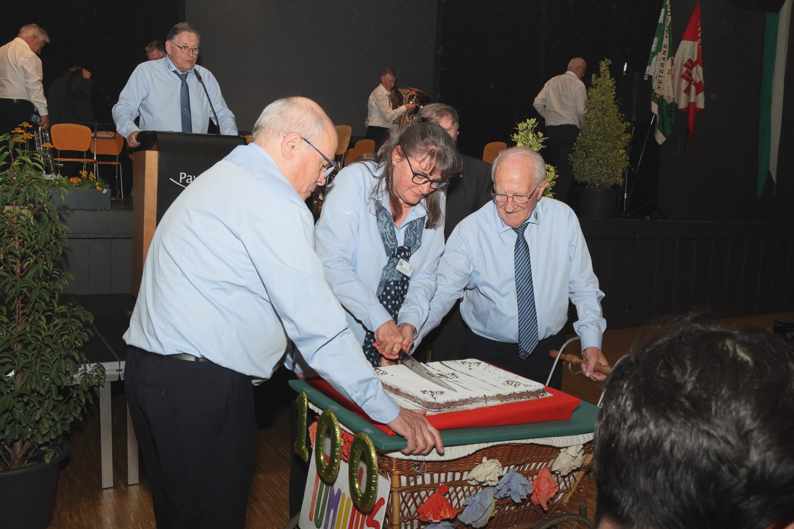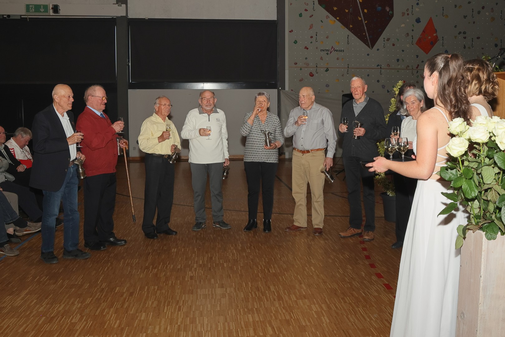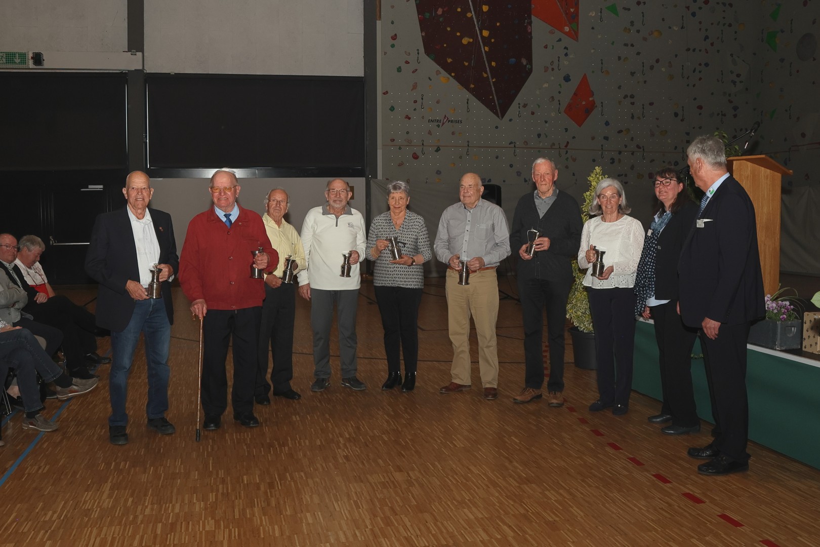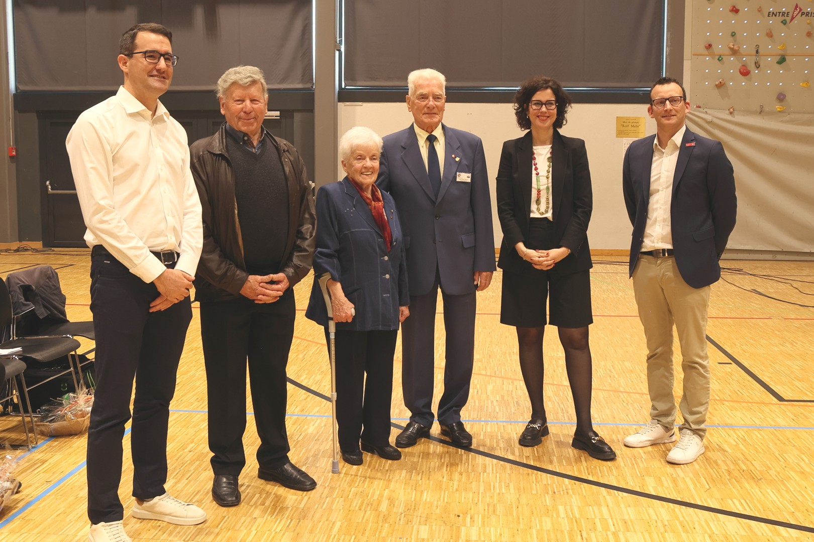 Les réunions des Vétéran·e·s sont toujours consacrées à l’évocation des souvenirs, c’est dans l’ADN du groupe, mais l’anniversaire a renforcé cette tradition : la bannière a parcouru plus de trajet que d’habitude, on a honoré la mémoire des membres décédés, remis la channe à huit octogénaires, salué la doyenne et le doyen de la journée, applaudi particulièrement trois gymnastes qui ont participé à la Fête fédérale de 1951 à Lausanne, distribué une plaquette qui retrace un siècle d’activités. Le président Etienne Miéville et le président honoraire Jean-Claude Mottaz n’ont pas manqué de relier l’histoire à la volonté inamovible de promouvoir la gymnastique au profit de la jeunesse. Et de se féliciter de voir leur groupe, exclusivement masculin à l’origine, compter maintenant 44 % de femmes sur 1211 membres.